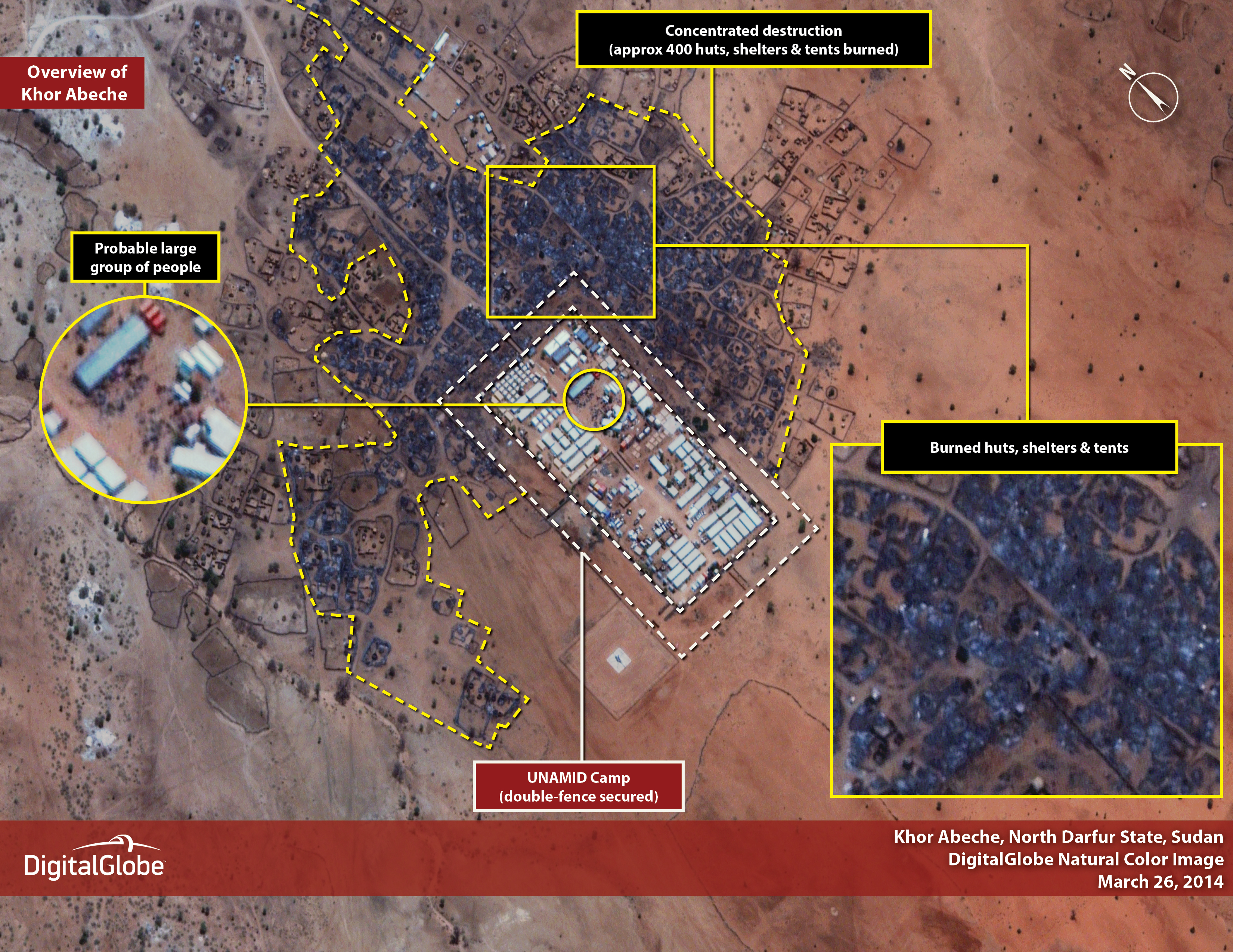 Confirming reports that first emerged from local sources and Radio Dabanga, new Satellite Sentinel Project (SSP) imagery from March 26, 2014 shows more than 400 huts, tents, and temporary shelters burned by Sudanese government-backed Janjaweed forces in Khor Abeche, at a South Darfur camp for internally displaced people (IDPs) located near a peacekeeping base. DigitalGlobe Intelligence Solutions (DGIS) image analysis finds that most of the destruction affected the structures adjacent to the African Union – United Nations Mission in Darfur (UNAMID) peacekeeping compound, which itself was not damaged.