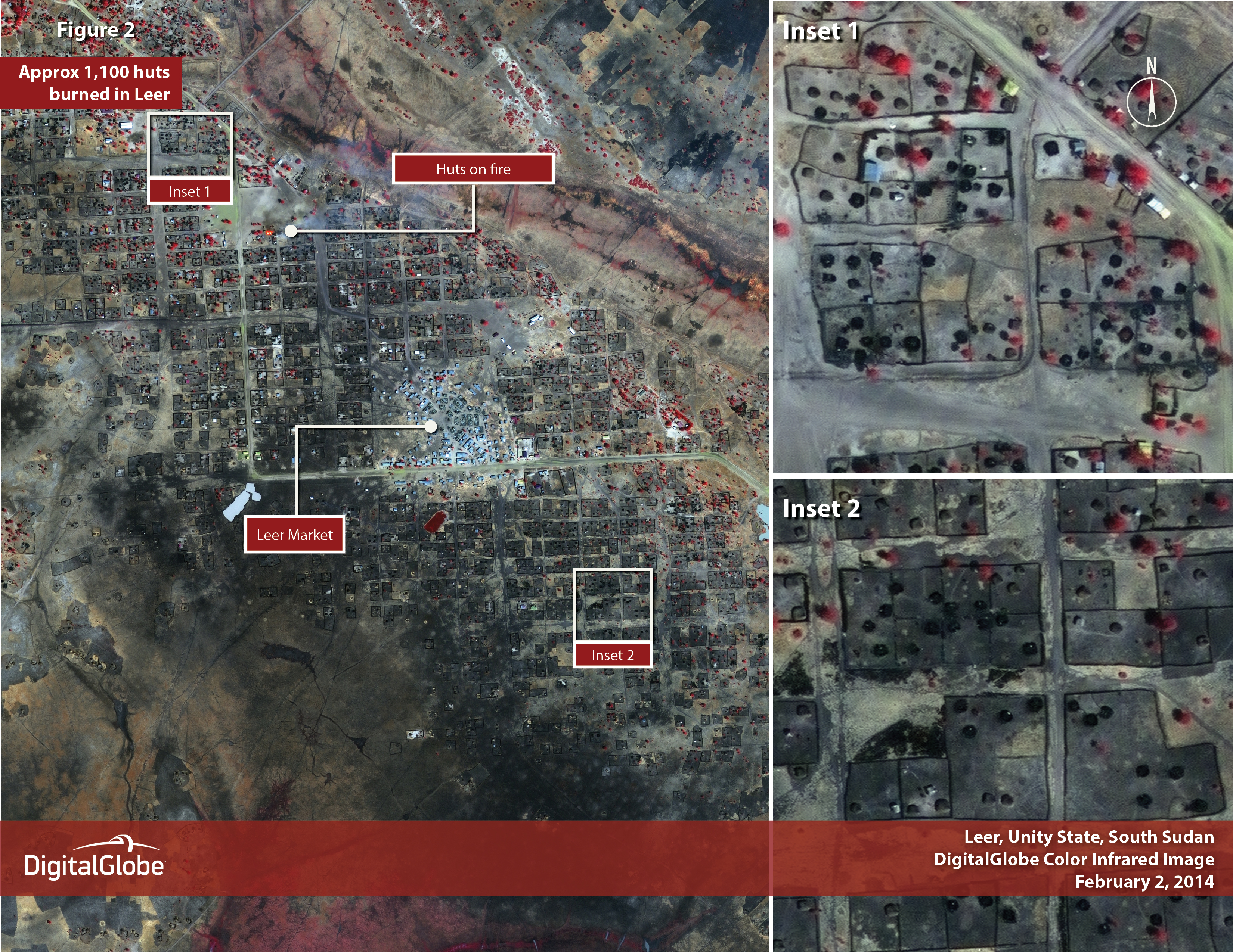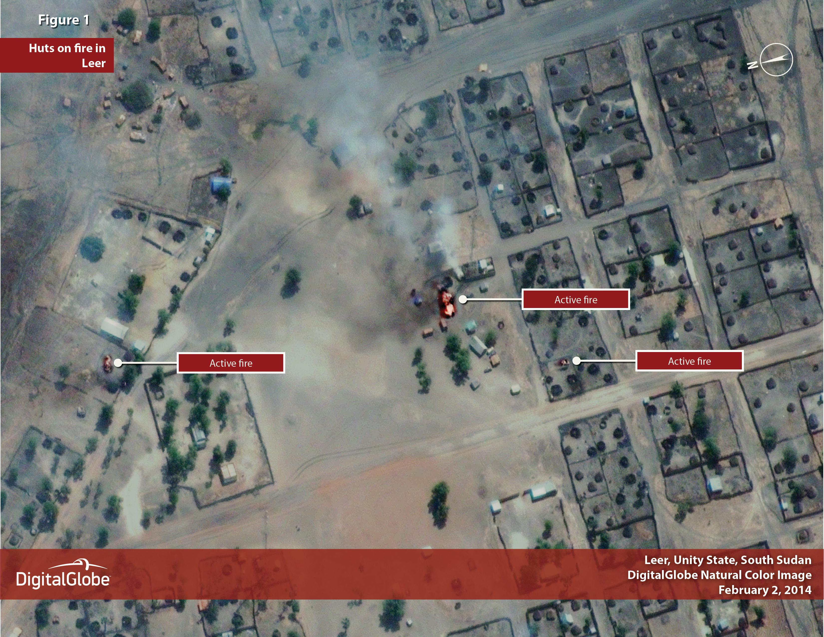 New DigitalGlobe satellite images acquired on February 2, 2014 confirm at least one violation of the cessation of hostilities agreement signed by South Sudan's combatant forces less than two weeks ago. Imagery of Leer town in Unity state, which journalists and aid workers have been unable to visit since the latest bout of violence, shows huts engulfed in flames.